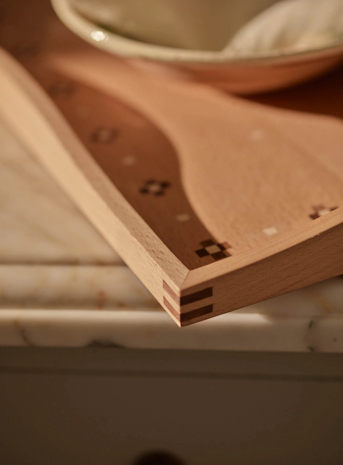 - A refined wooden tray with a delicate, understated inlaid pattern