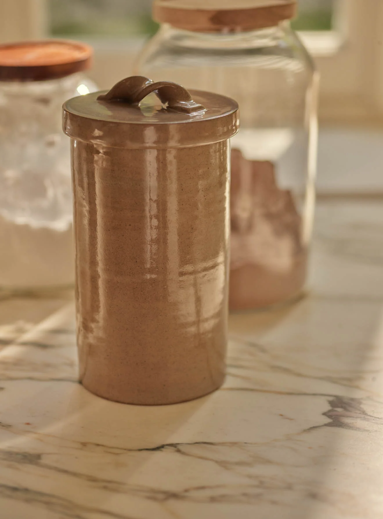 - A handcrafted stoneware storage jar with a delicately twisted handle on the lid