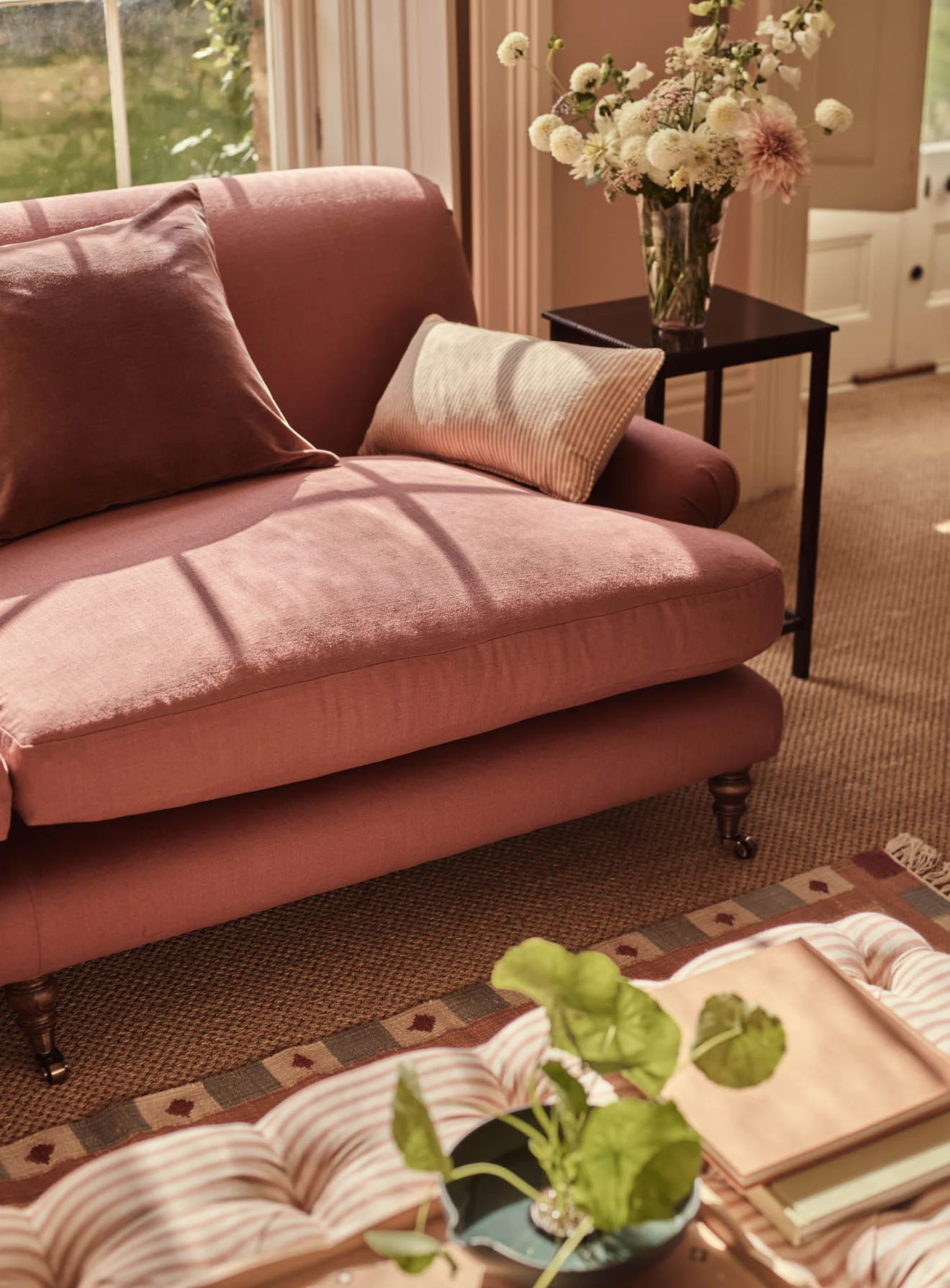 - Upholstered in a gentle rose linen, grown and woven in Belgium